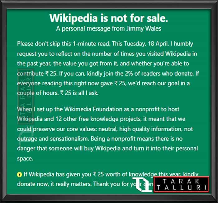2023 : వికిపెడియా వ్యవస్థాపకుడు వికిపెడియాను వాడుకునే ప్రతి ఒక్కరూ 25 రూపాయలు విరాళం ఇవ్వాలని ఆయన వెబ్సైట్ లో అభ్యర్ధించాడు. ఇప్పటికే 2 శాతం యూజర్లు విరాళం ఇస్తున్నట్లు ప్రకటించాడు.